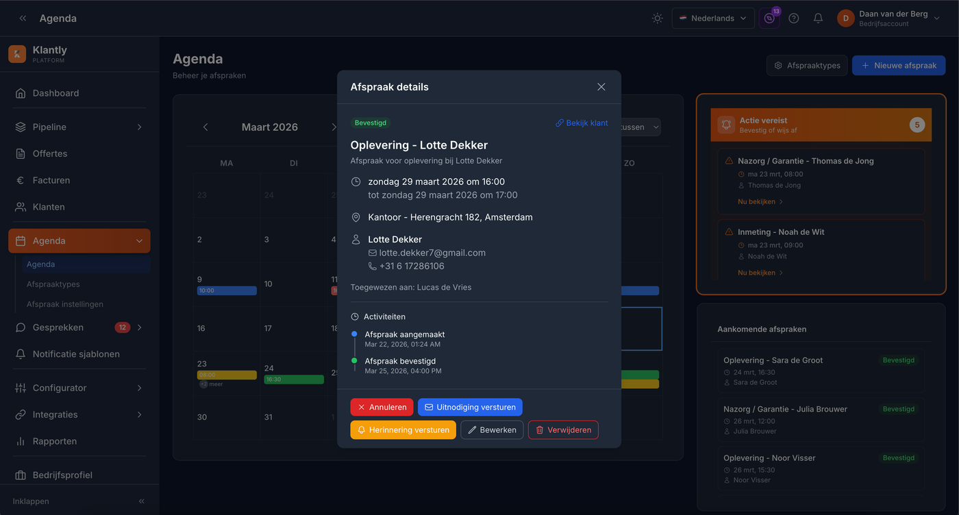 Plan direct vanuit de offerte een afspraak. De klant bevestigt online, zonder heen en weer mailen.