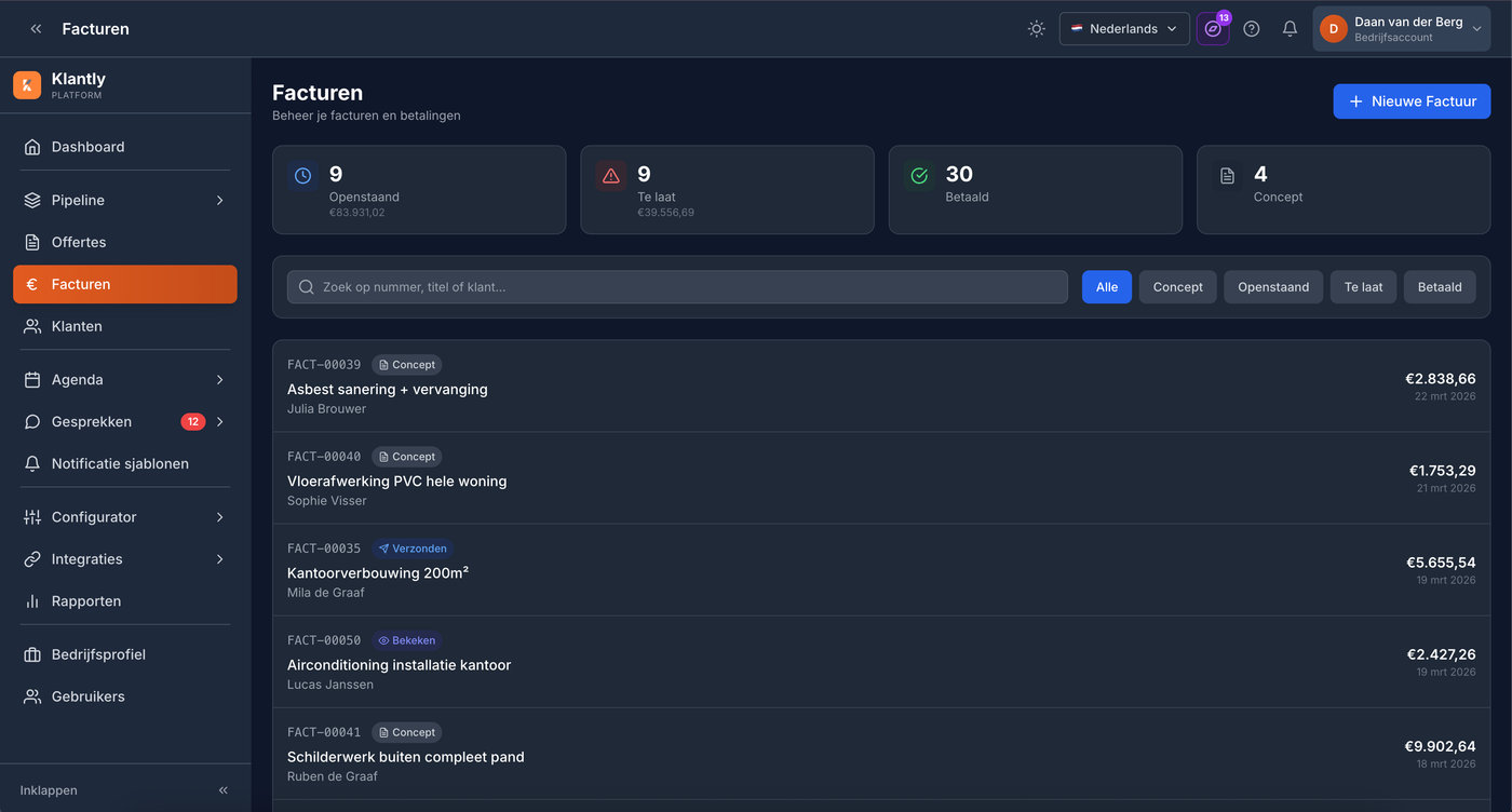 Klantly is een alles-in-één platform voor servicebedrijven zoals aannemers, installateurs en zzp’ers. Je beheert offertes, facturen, klanten, planning en communicatie vanuit één systeem.